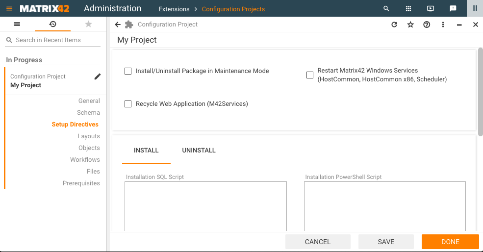 Use this section to manually configure the Configuration Project installation/uninstallation properties and provide additional SQL and/or PowerShell scripts.